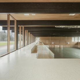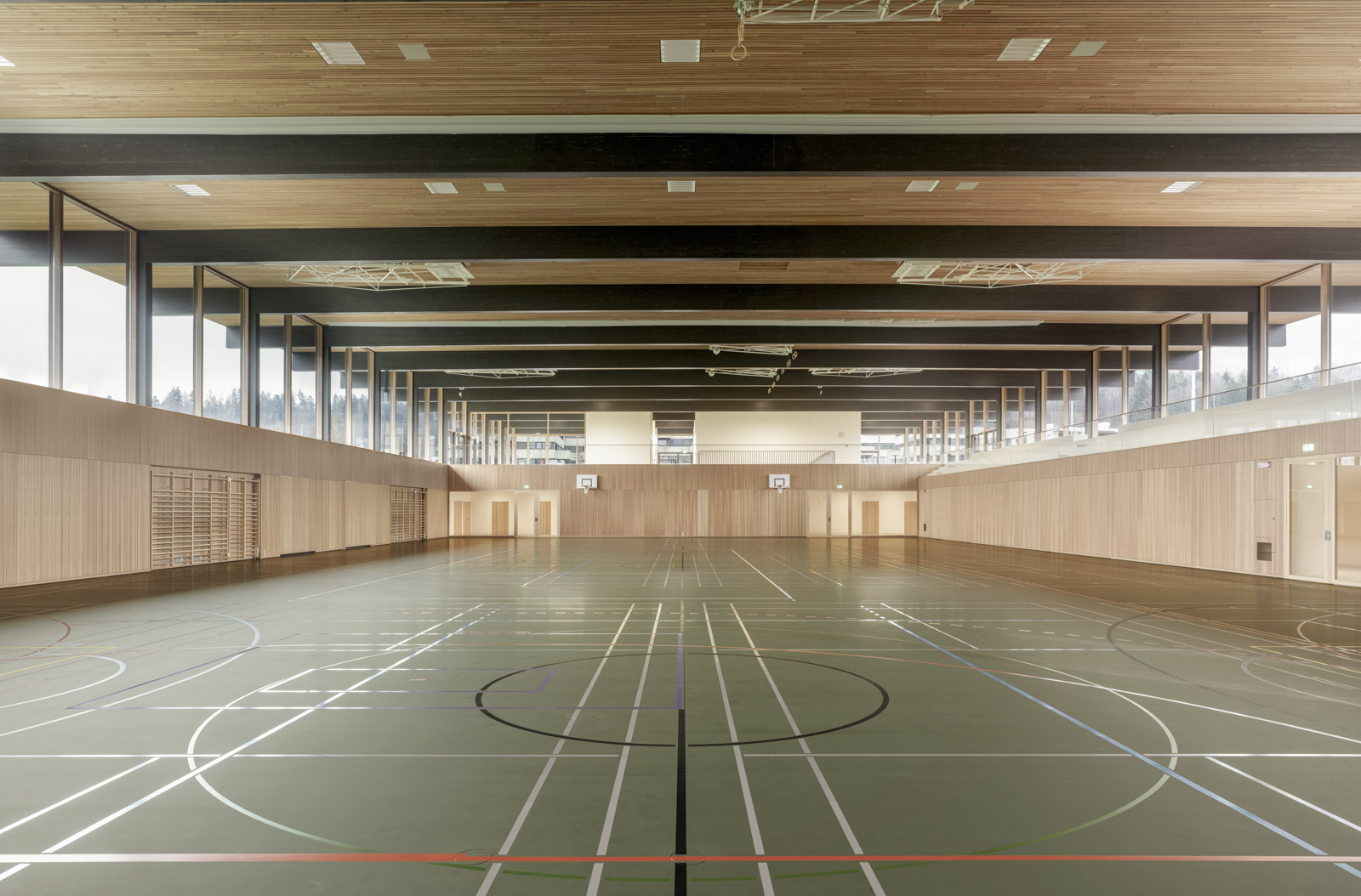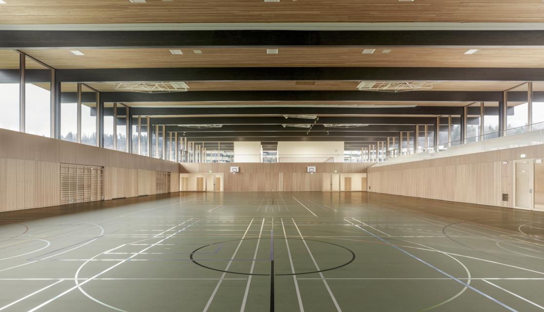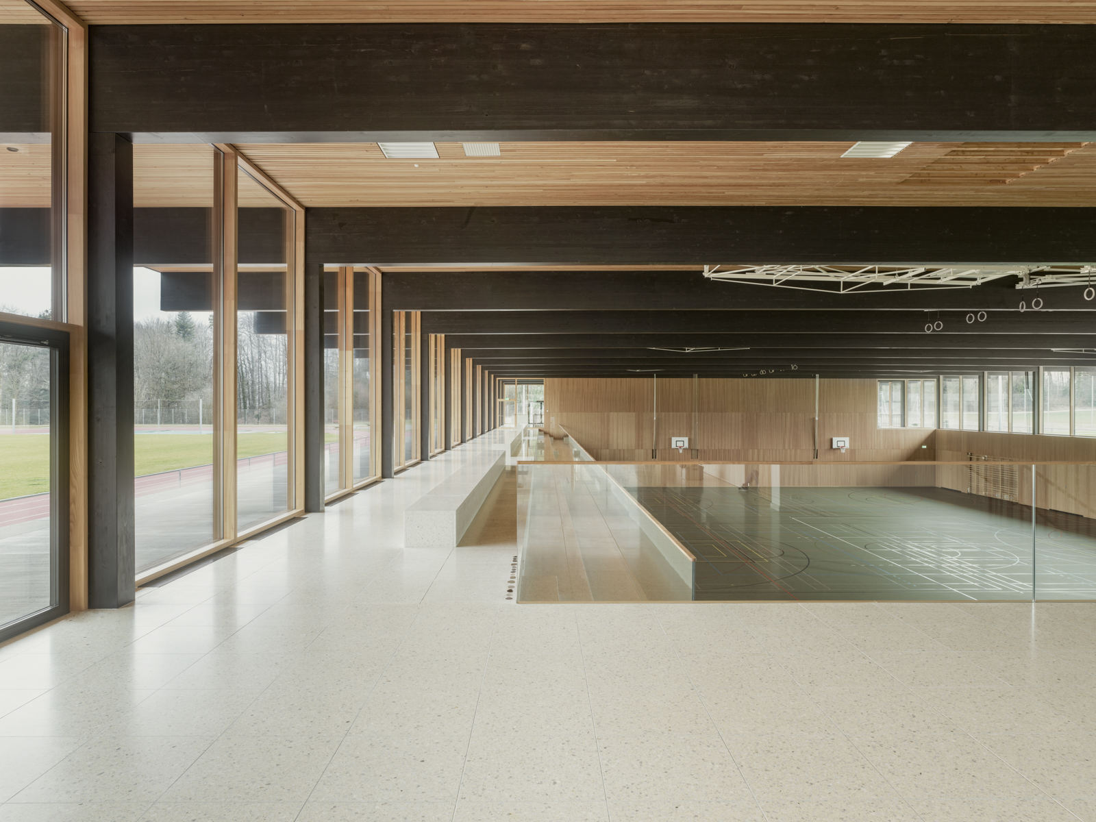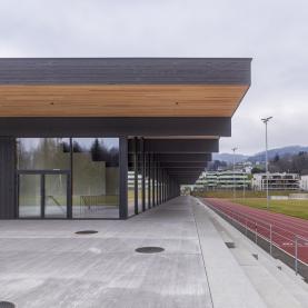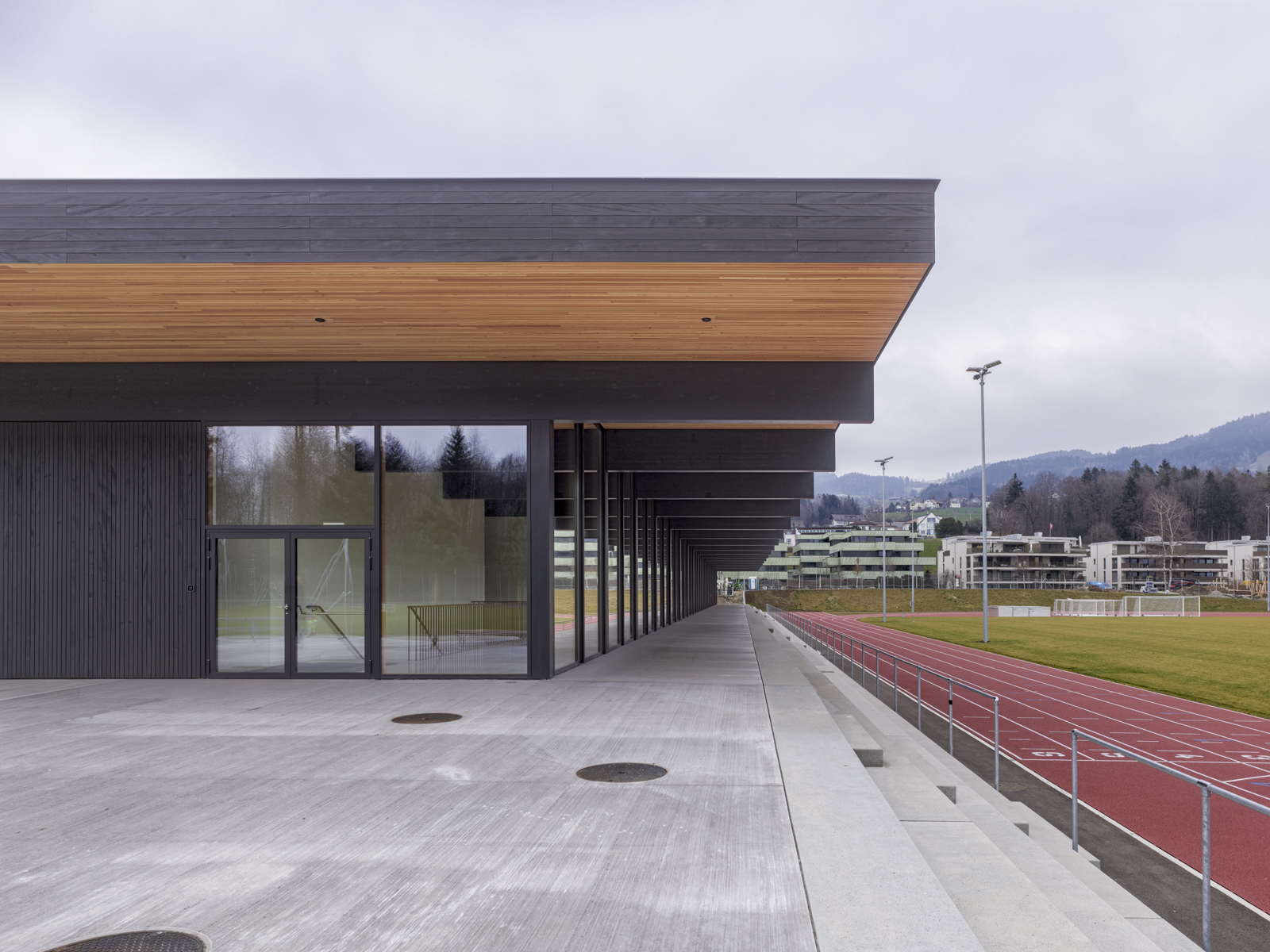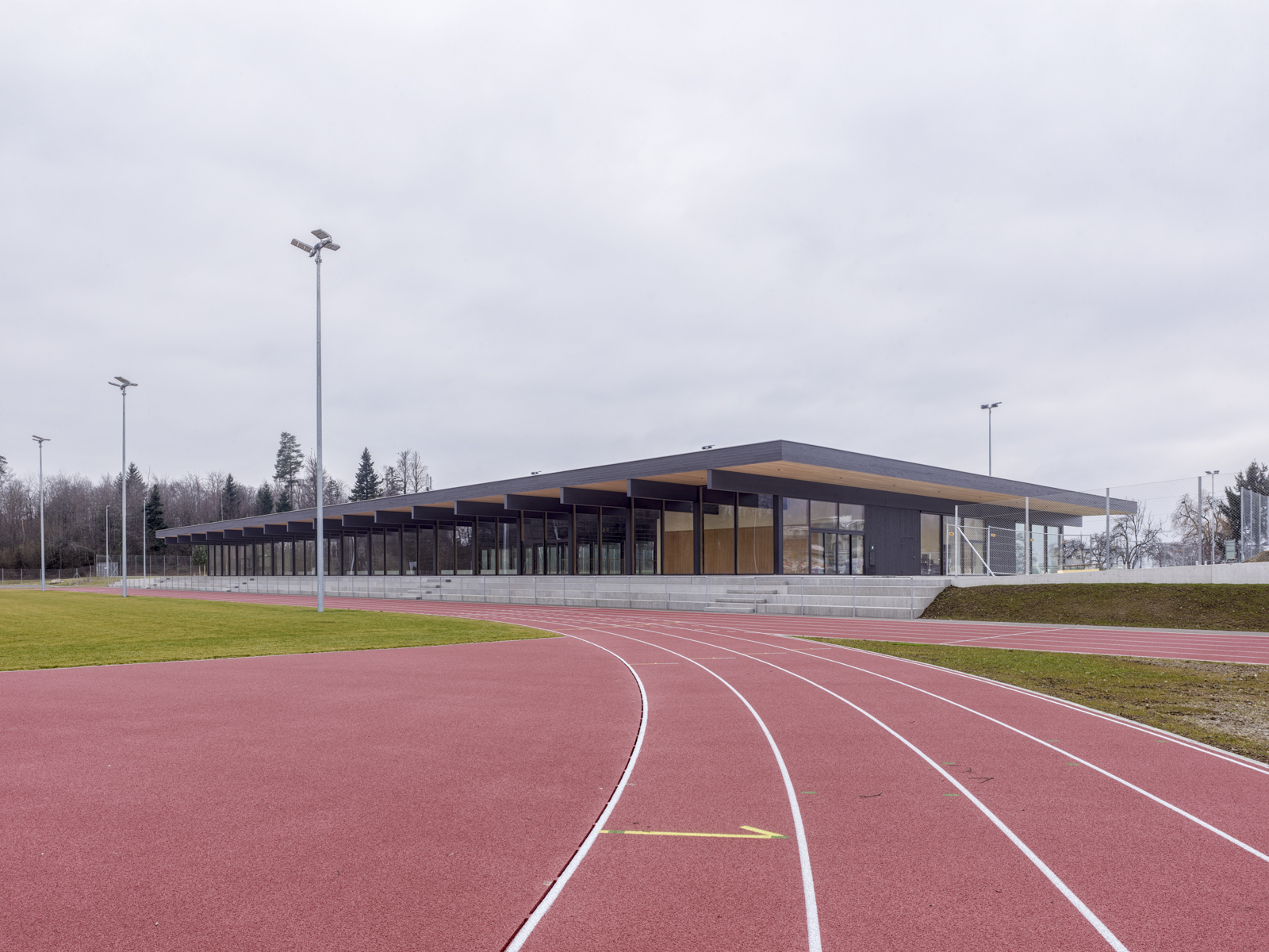 filigrane Hallenbau mit allseitig auskragendem Vordach