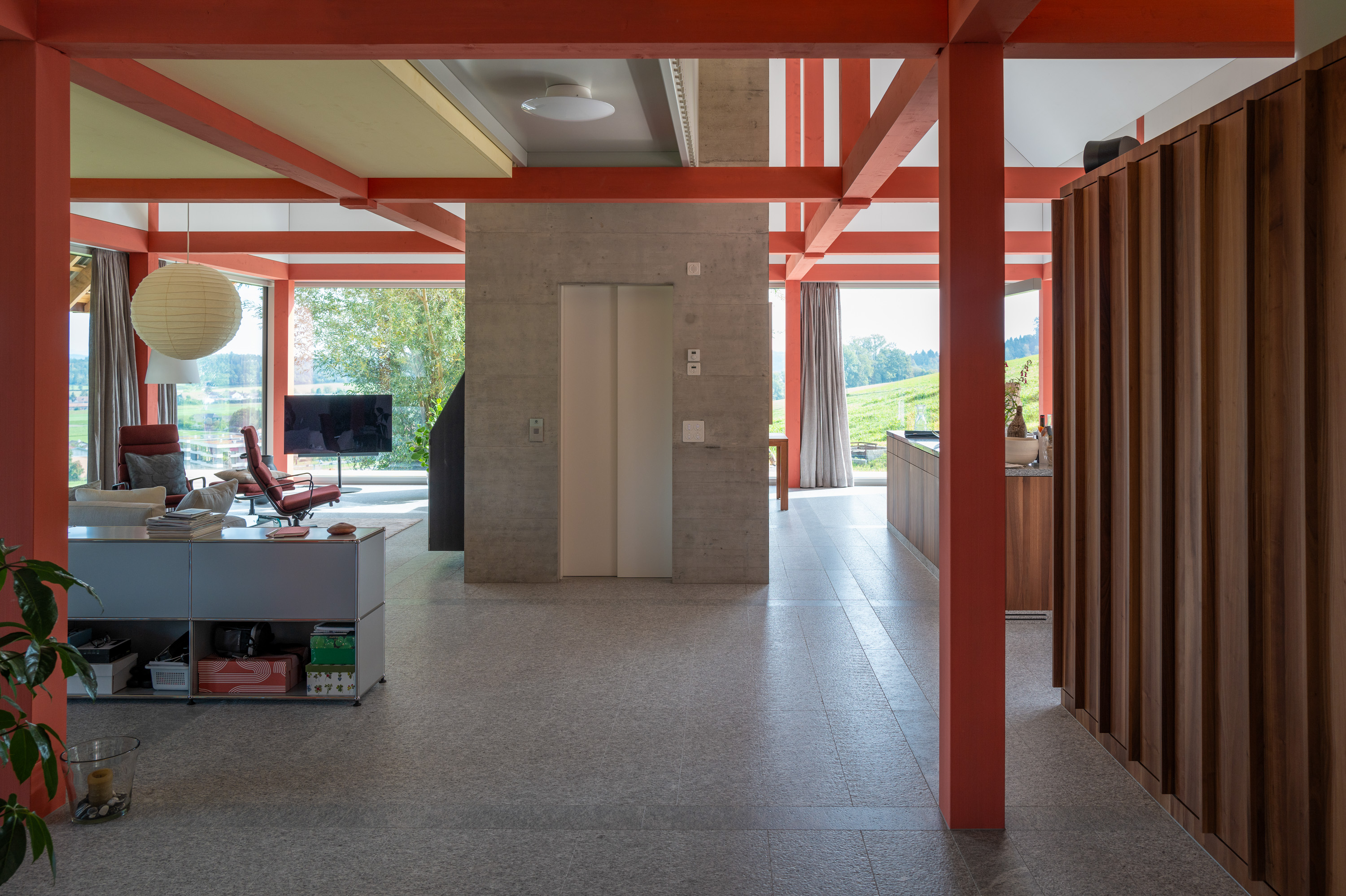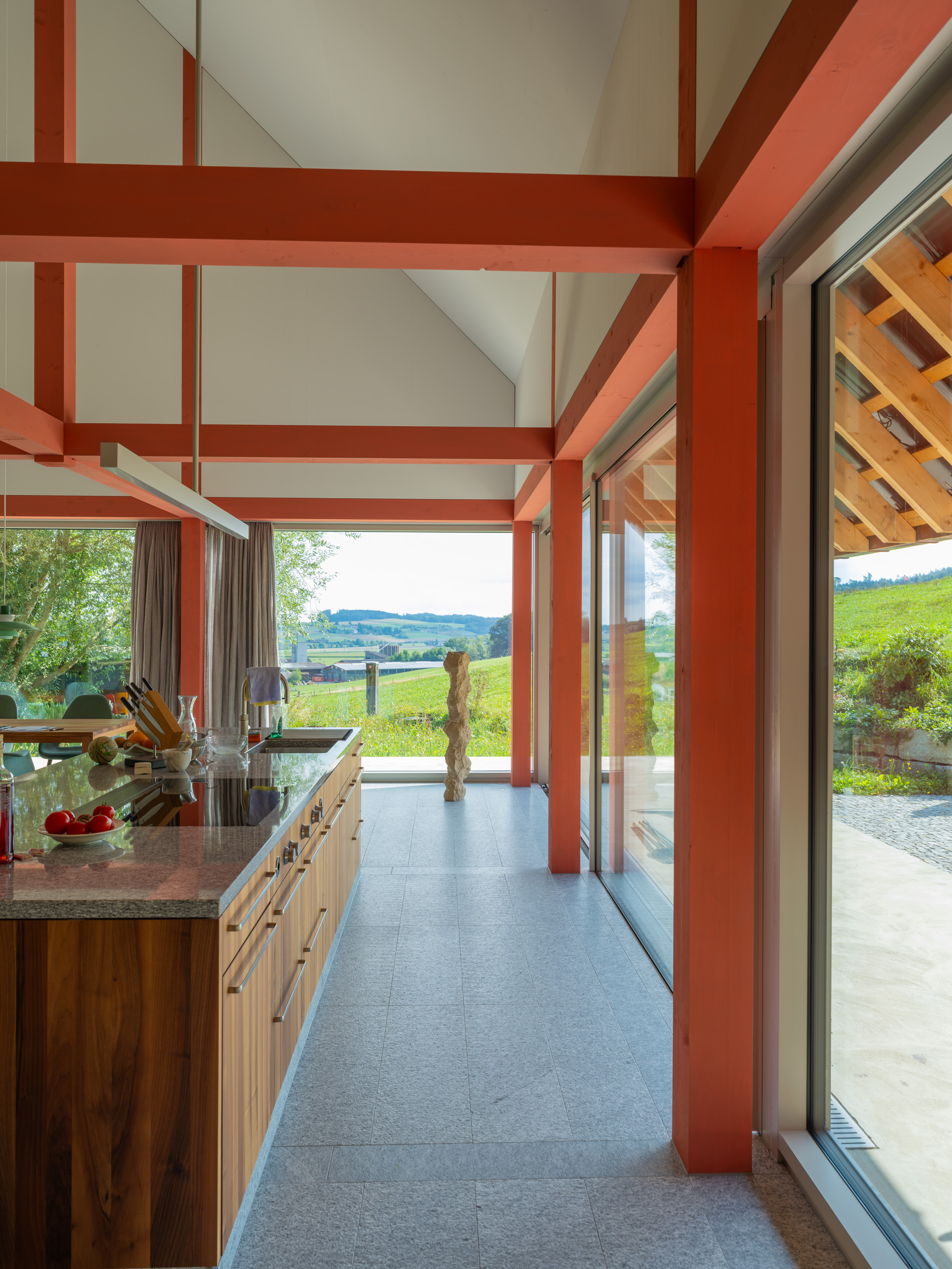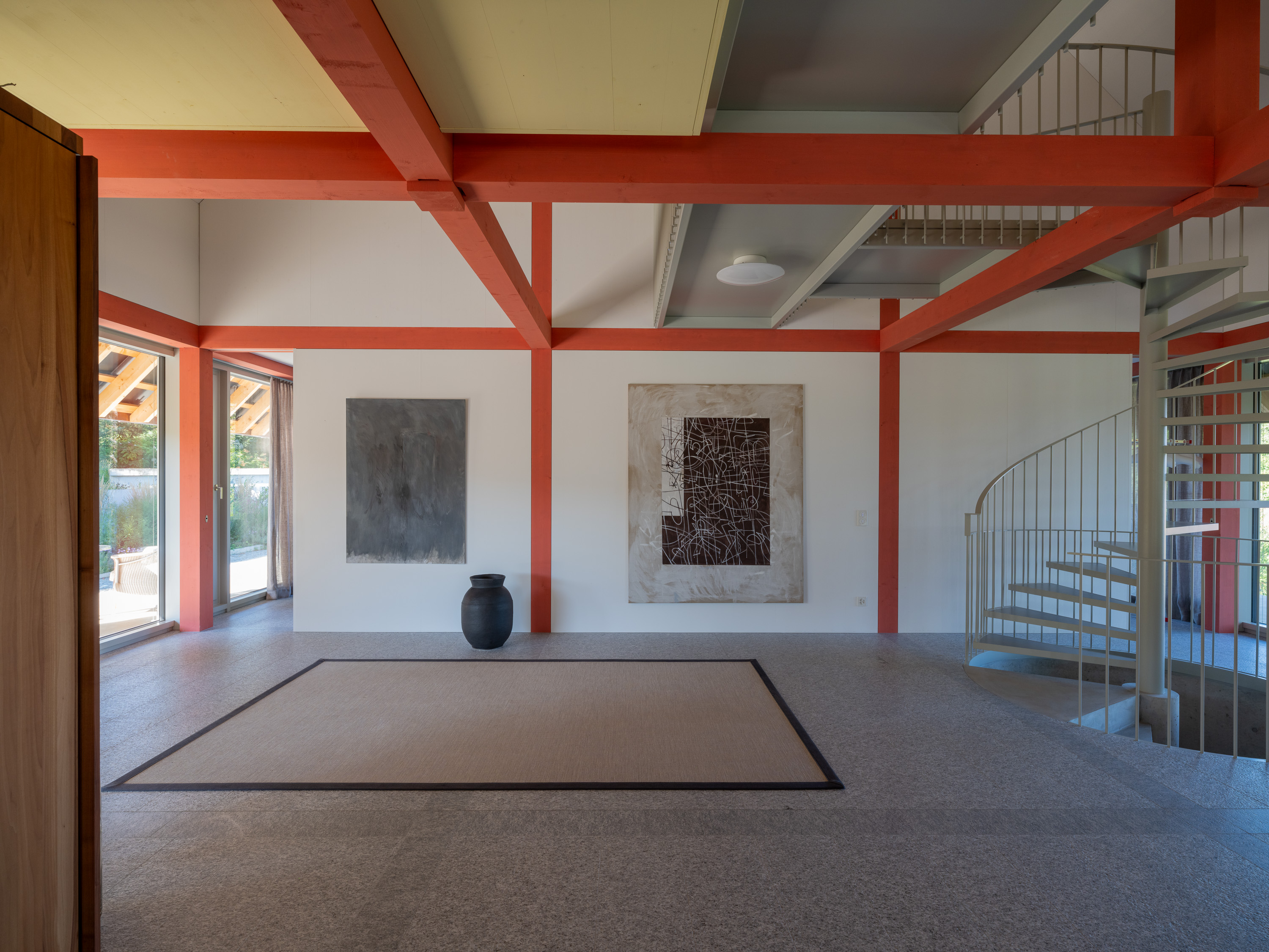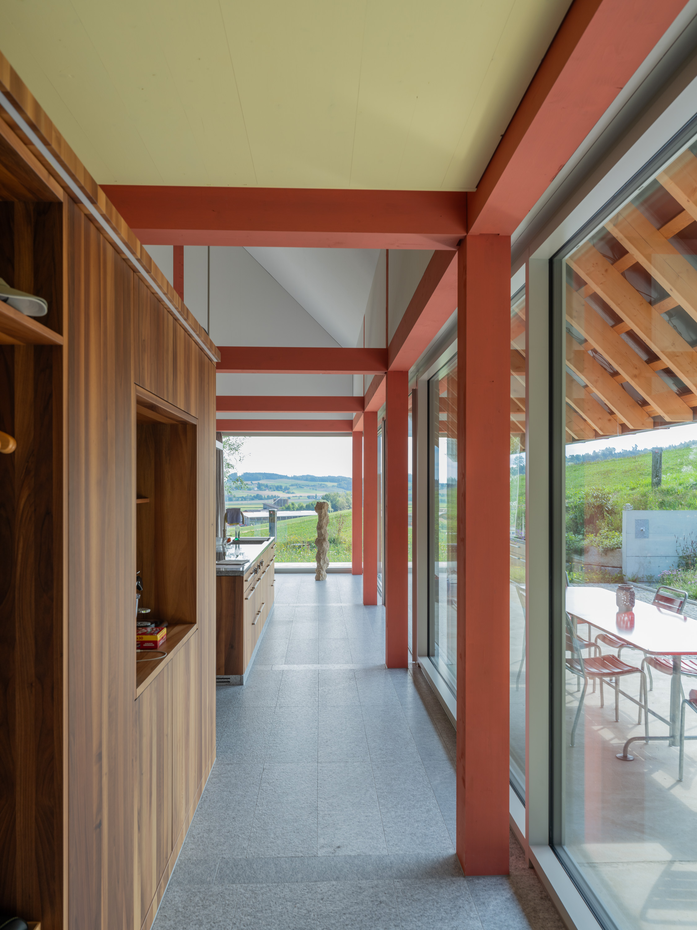 tragende Struktur – ein dreidimensionales, gitterartiges Gefüge aus rot gebeiztem Holz