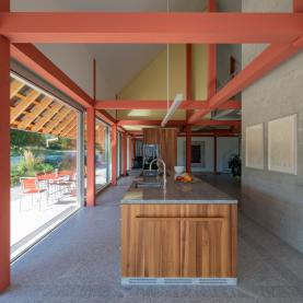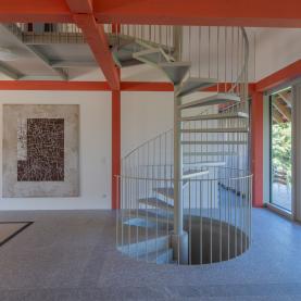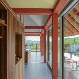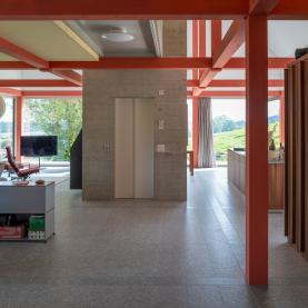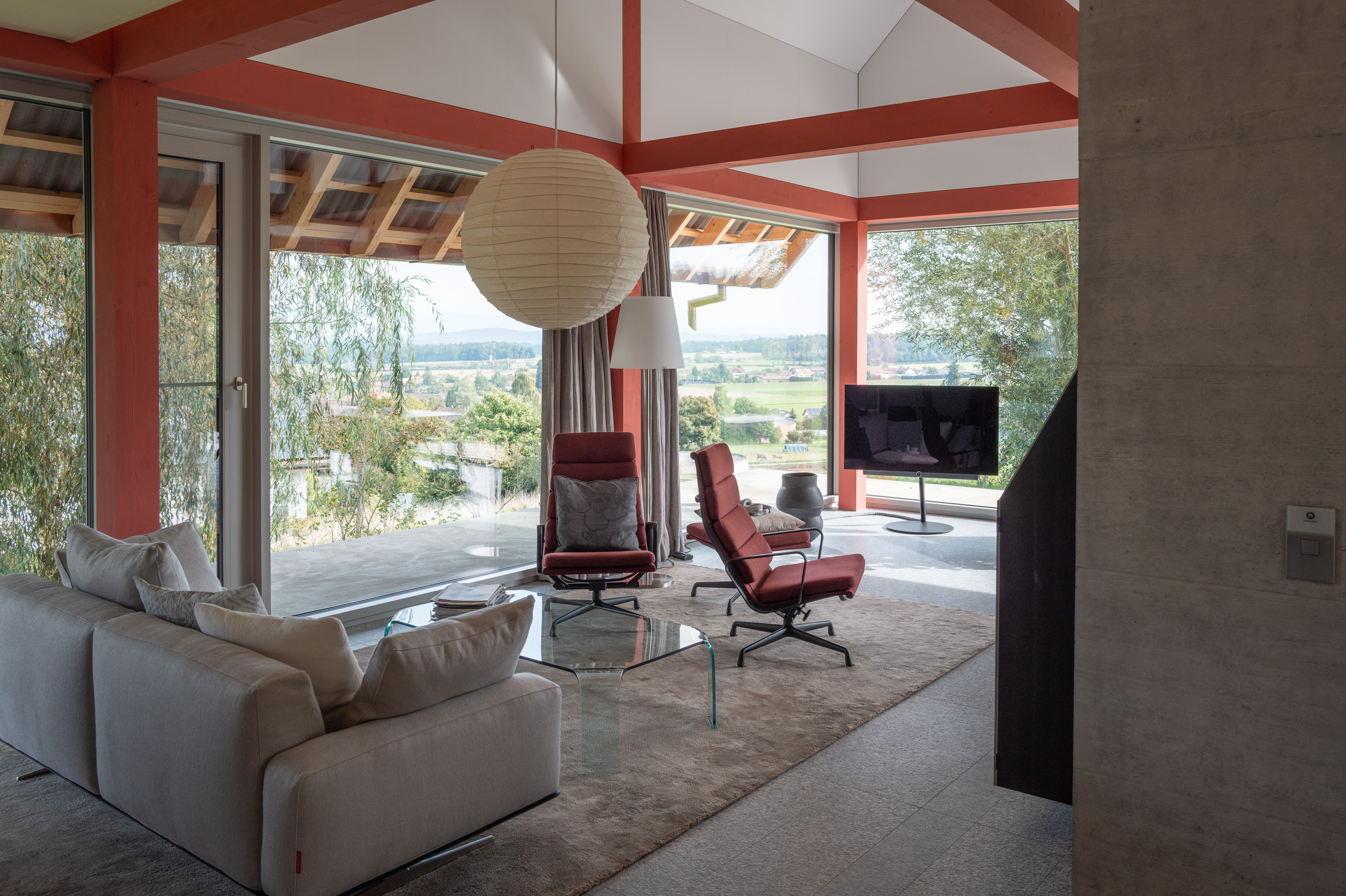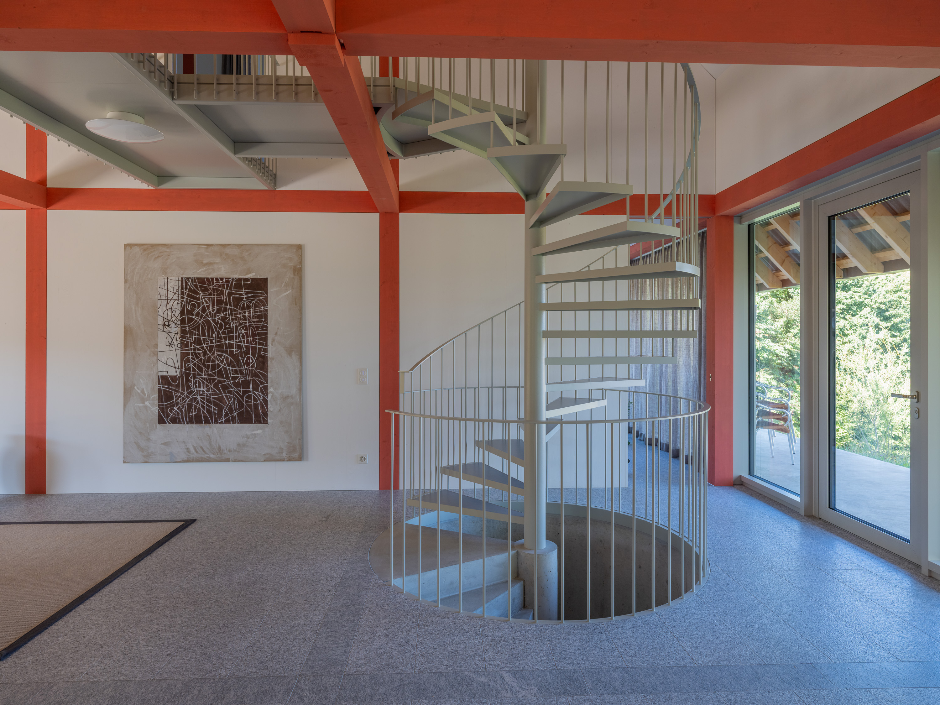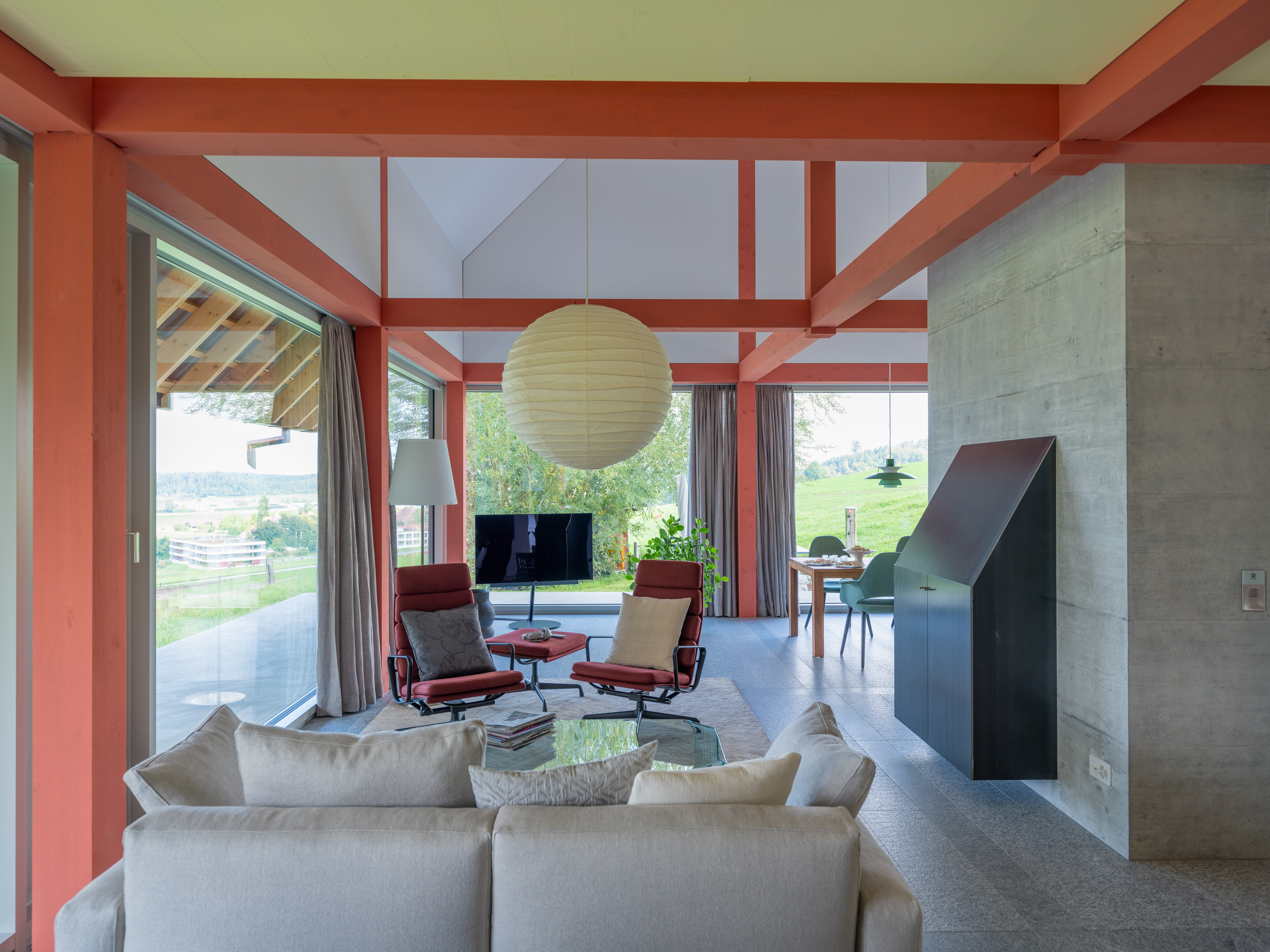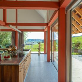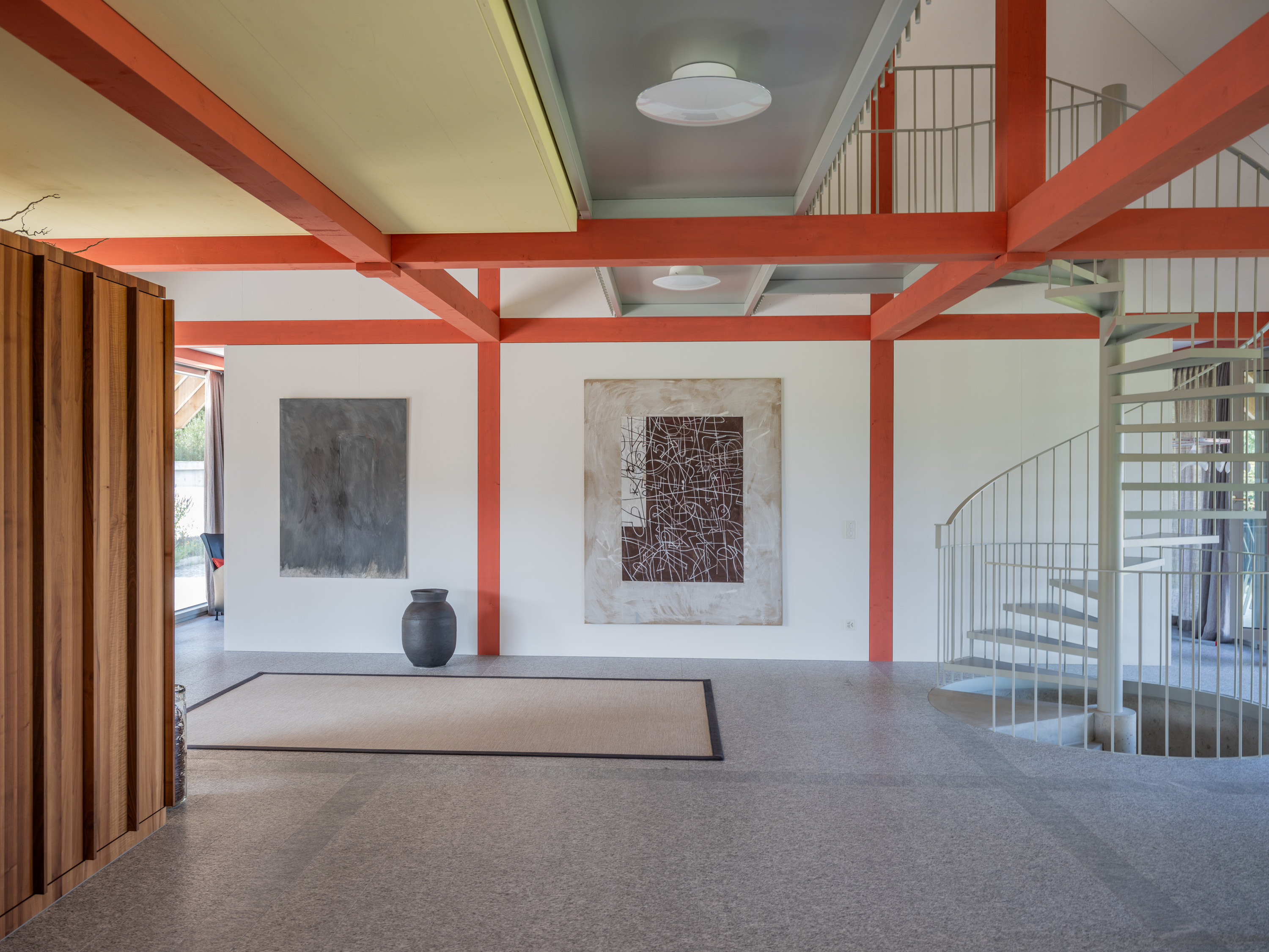 tragende Struktur – ein dreidimensionales, gitterartiges Gefüge aus rot gebeiztem Holz