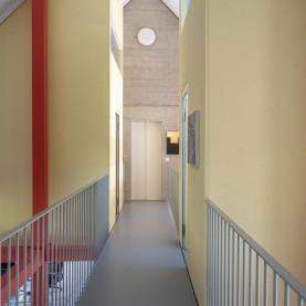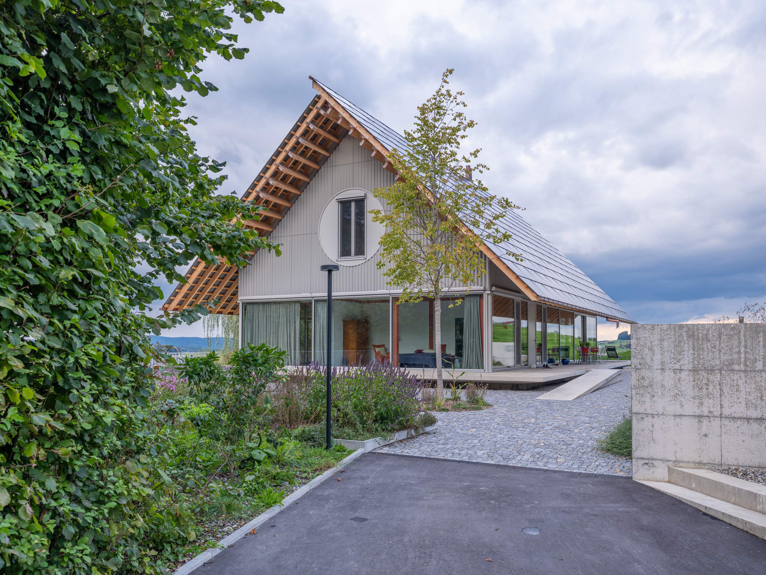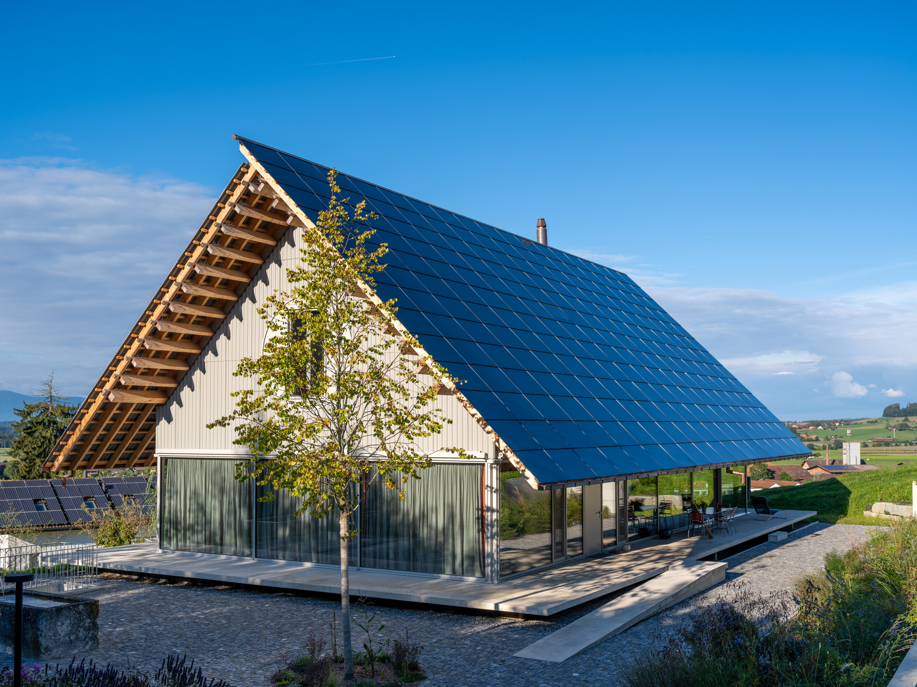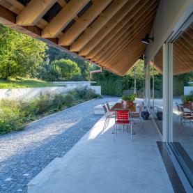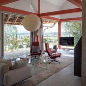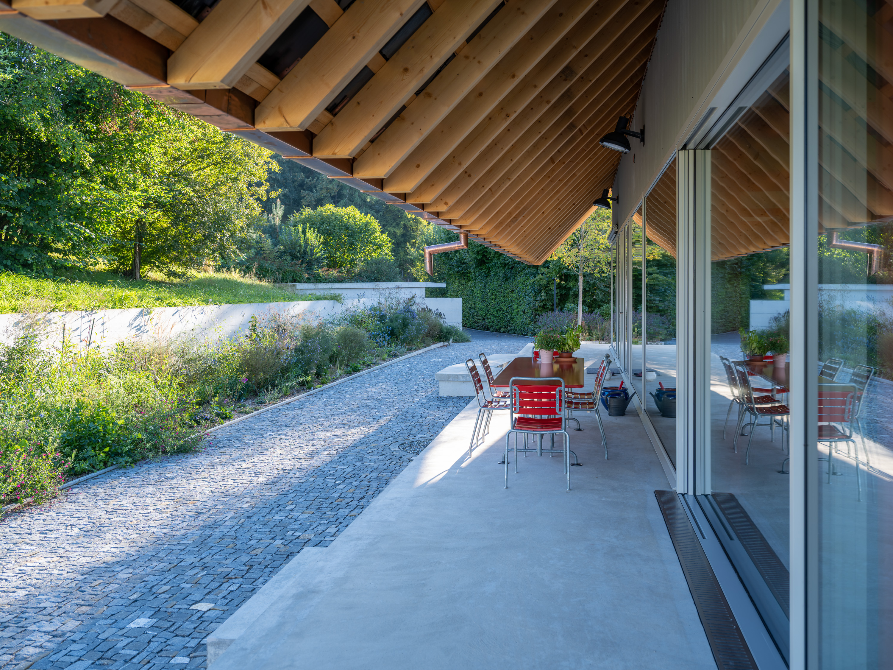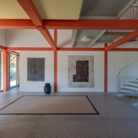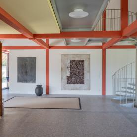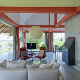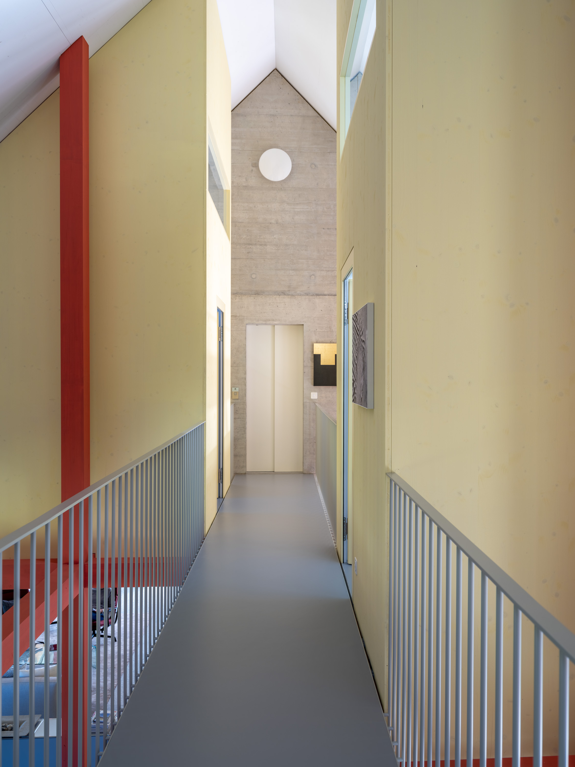 tragende Struktur – ein dreidimensionales, gitterartiges Gefüge aus rot gebeiztem Holz