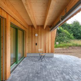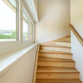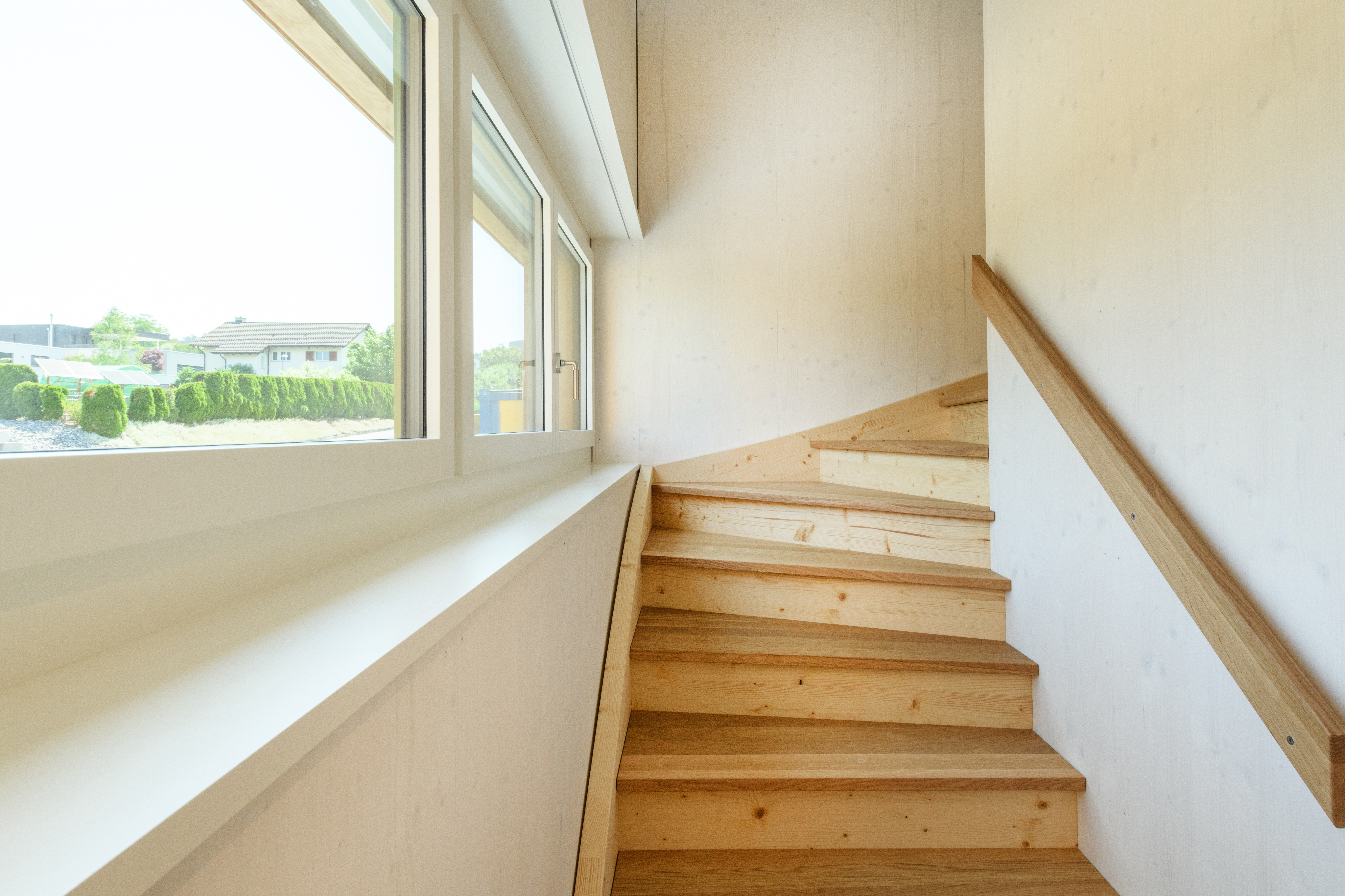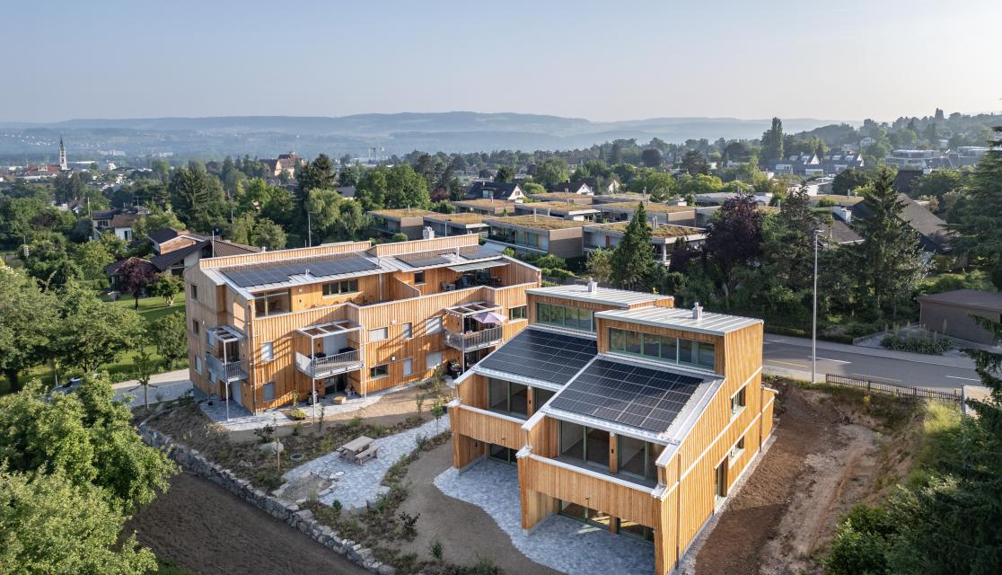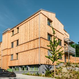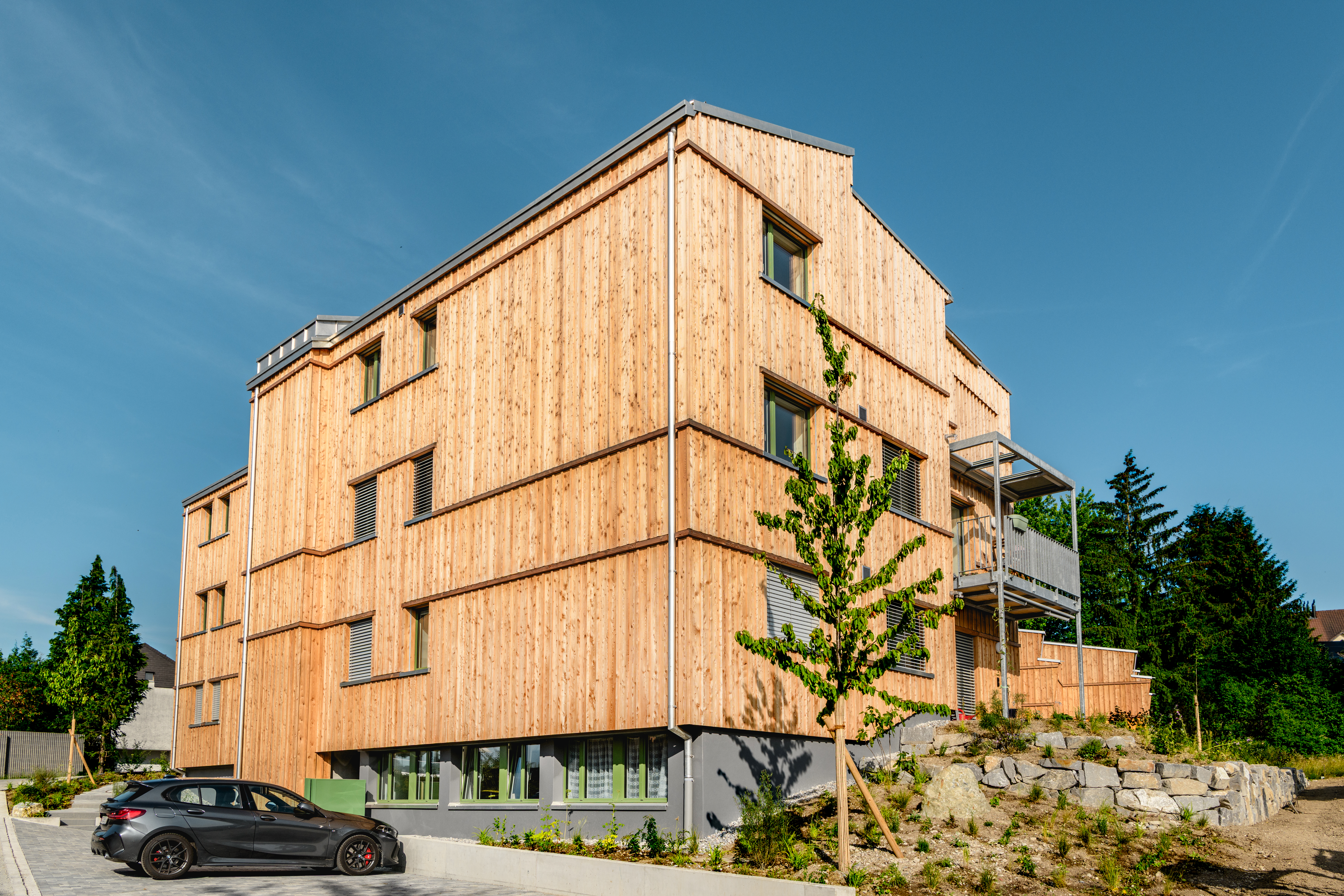 Treppenhaus und Lift wurden behindertengerecht erneuert, Grundrisse optimiert und mit vorgelagerten Balkonen ergänzt. Eine Tiefgarage mit zwölf Plätzen sowie zwei Reiheneinfamilienhäuser in Holzbauweise erweitern das Ensemble. So verbindet das Projekt Bestand und Neubau zu einem nachhaltigen Ganzen.