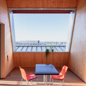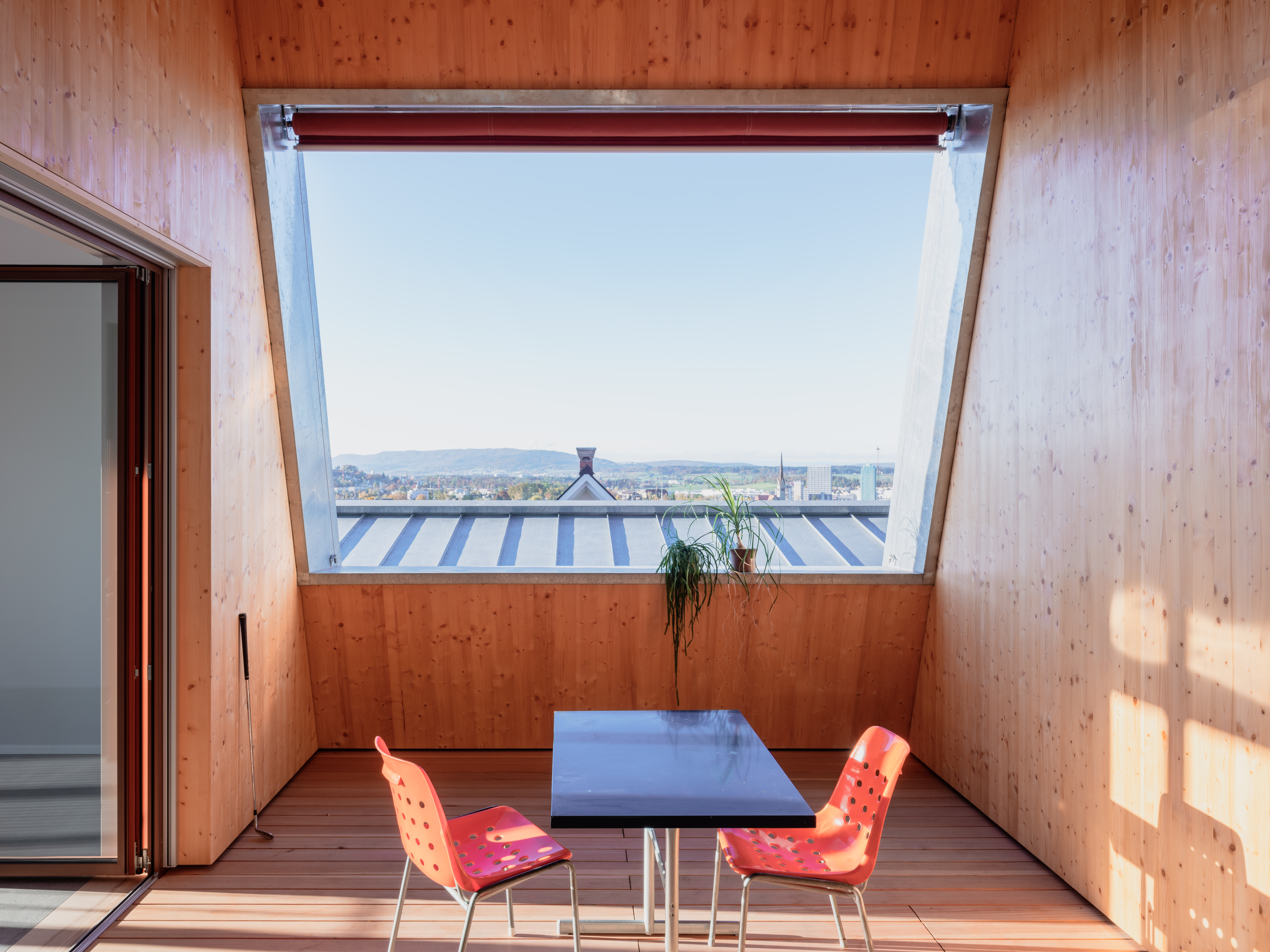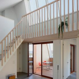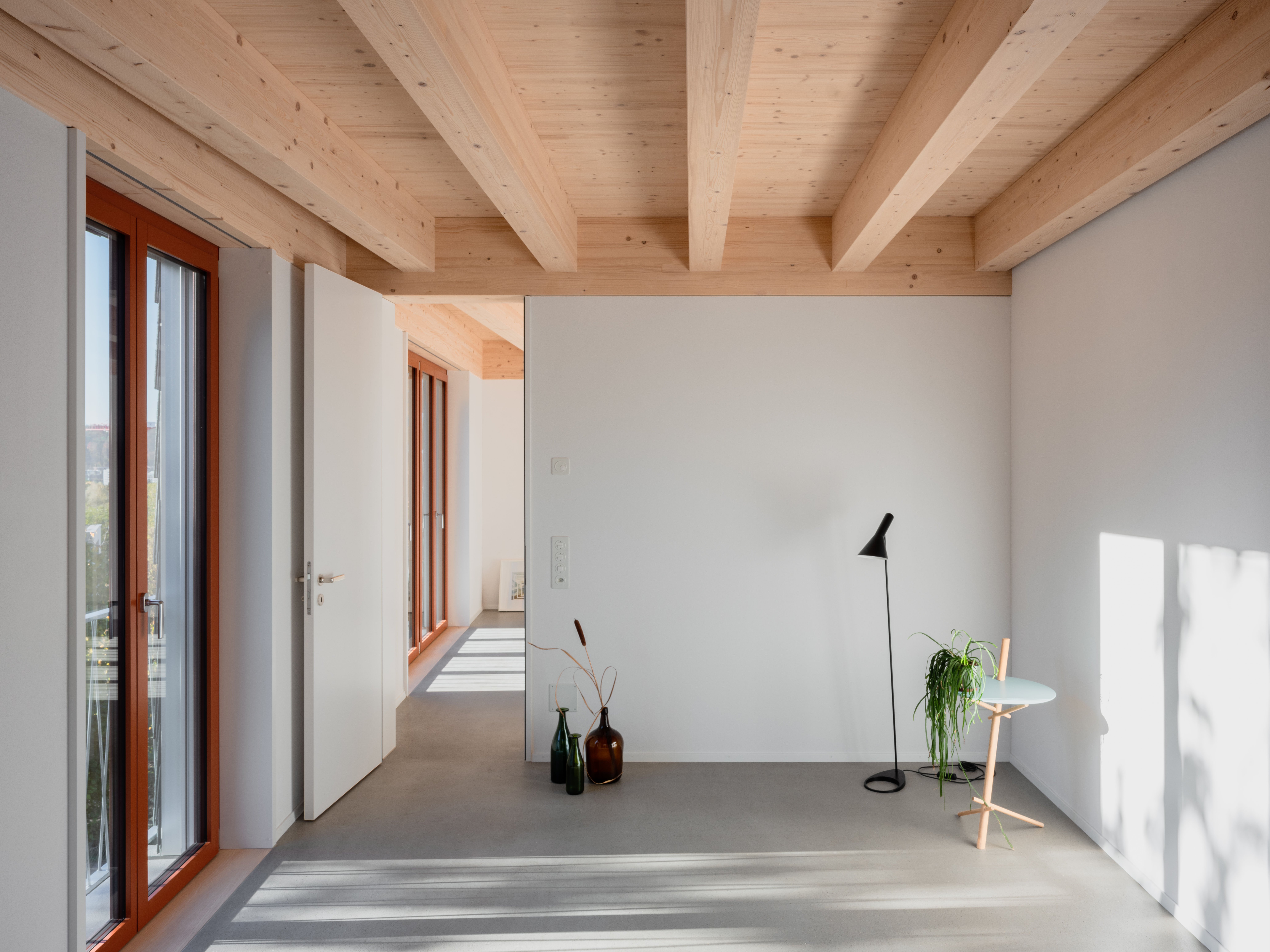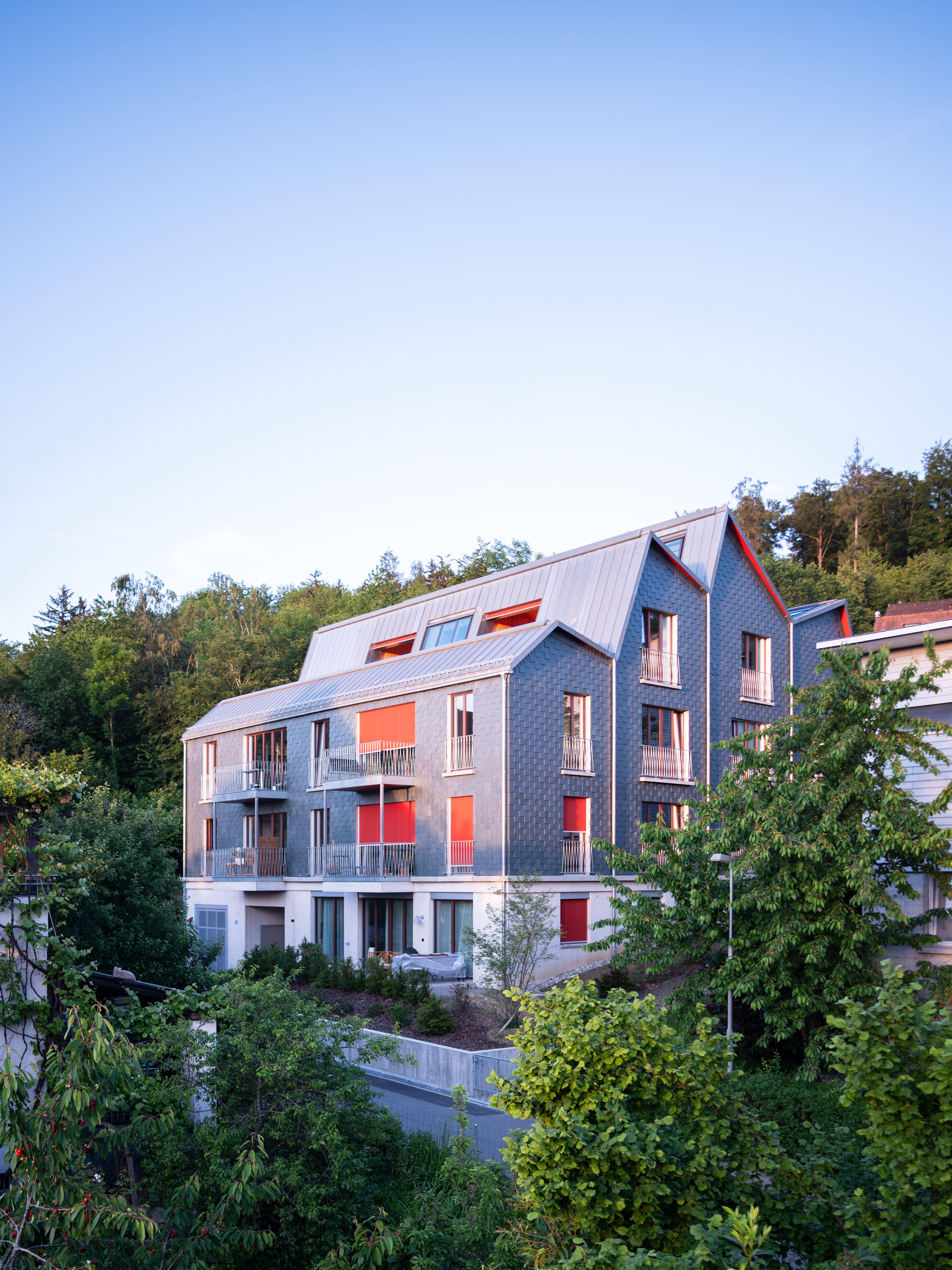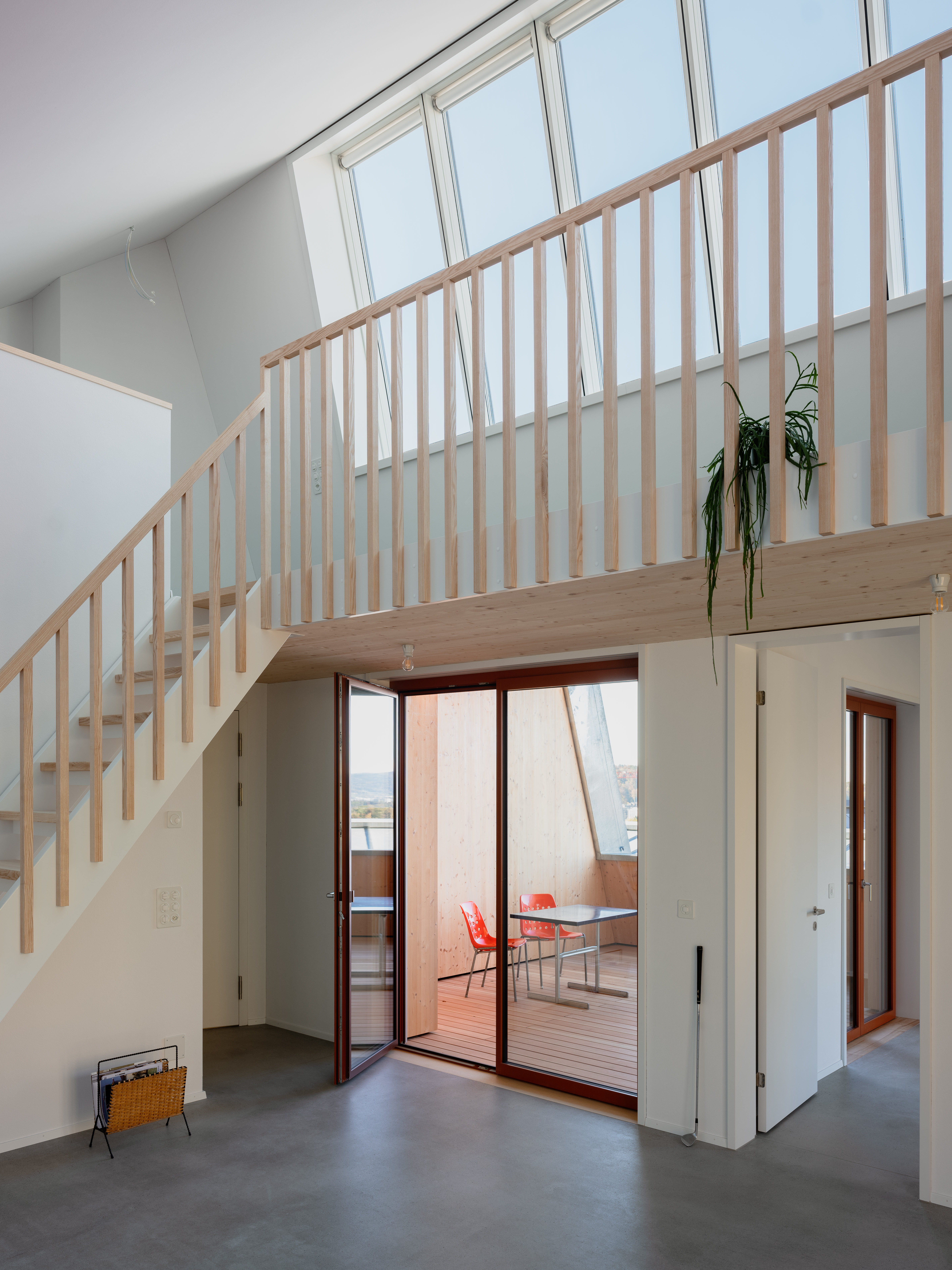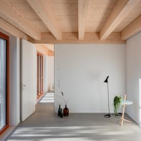 Das Wohnhaus mit seiner aufgefächerten Dachform steht am Rande eines Wohnquartieres direkt am Wald. Die Untergeschosse und das Treppenhaus sind in Massivbau konstruiert. Darauf ruhen die Wohngeschosse als tragender Holzbau. Die sichtbaren Balkenlagen und Dachschrägen in Holz prägen die Atmosphäre des Holzhauses.